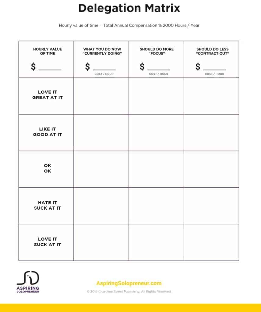 It is for this reason that I created the Delegation Matrix. Click this link to access the Delegation Matrix and related video: https://aspiringsolopreneur.com/tools-welcome/